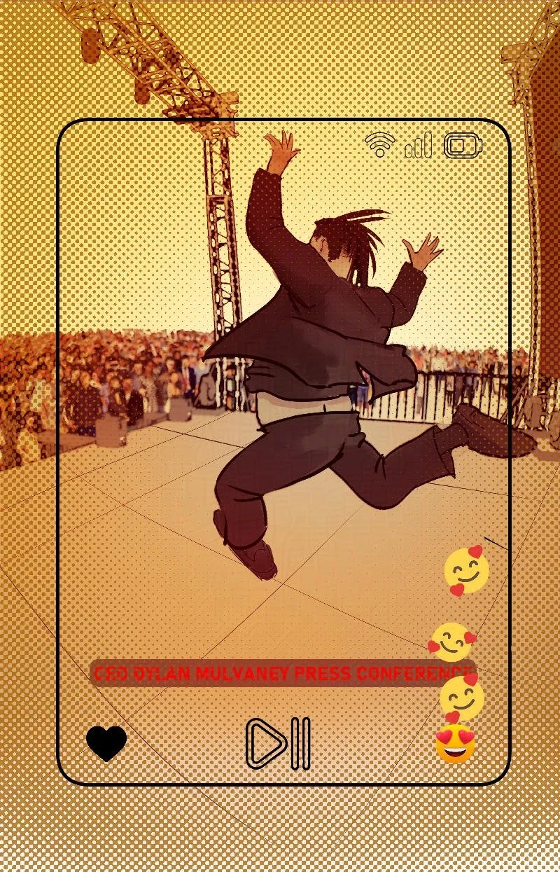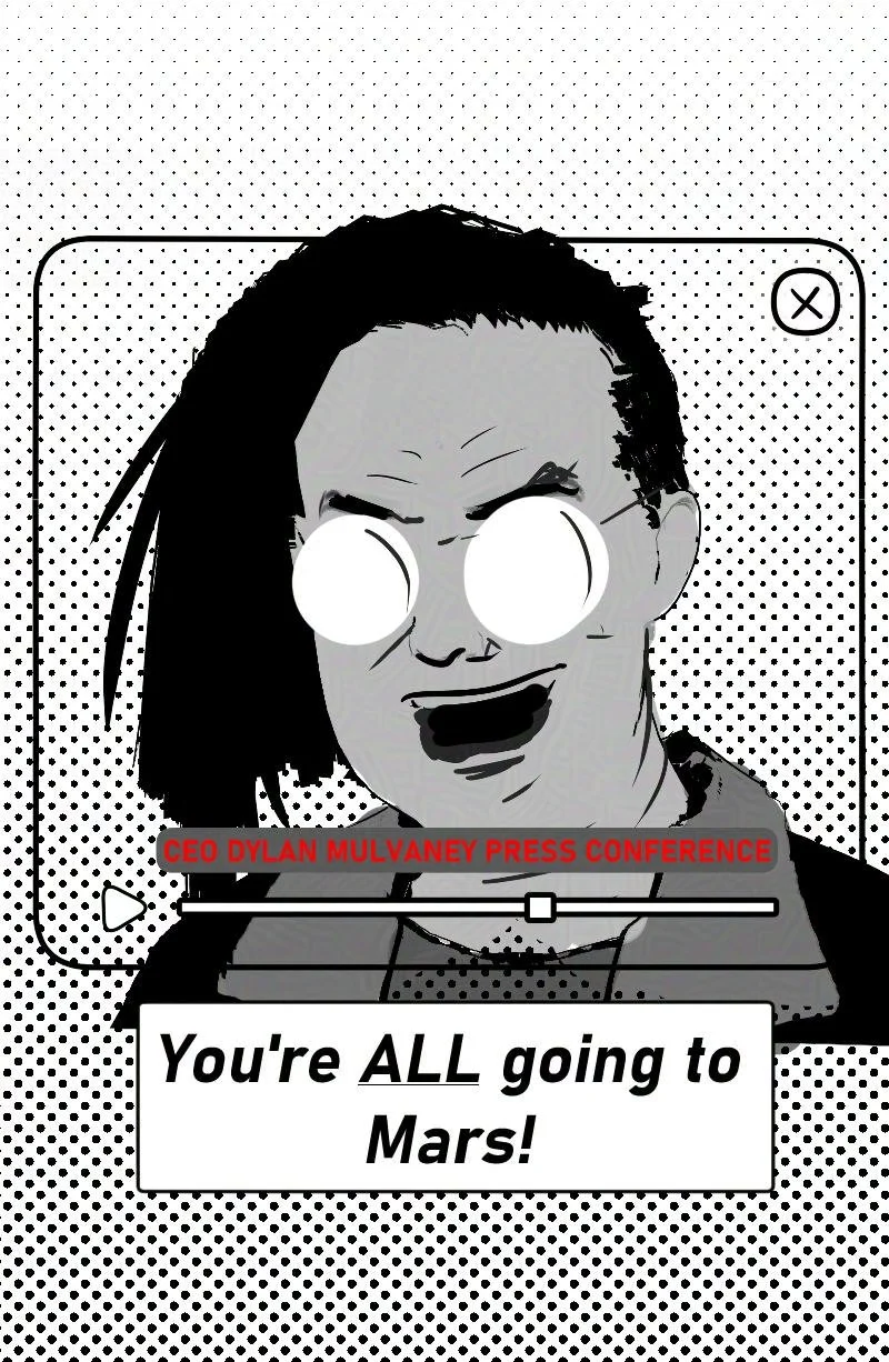 Black and white comic-style illustration of a smiling person with glasses and dark hair, wearing a hoodie. Text overlay: 'CEO Dylan Mulvaney Press Conference' and 'You're ALL going to Mars!'