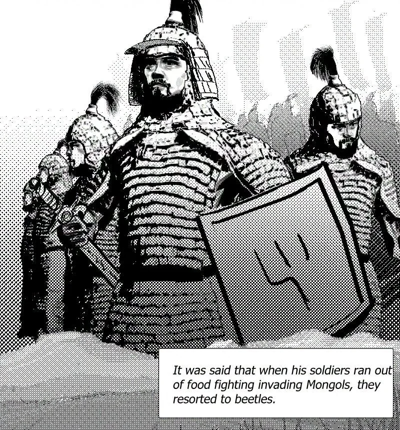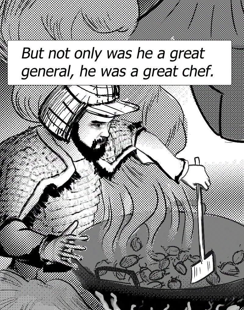A comic-style drawing of a man with a beard and medieval armor cooking food over a pot of boiling liquid, with steam rising. A speech bubble states, 'But not only was he a great general, he was a great chef.'