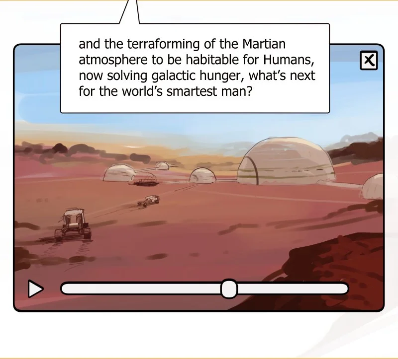 Illustration of a Mars landscape with domed huts and rovers, with a dialogue box discussing terraforming Mars for humans and solving galactic hunger.