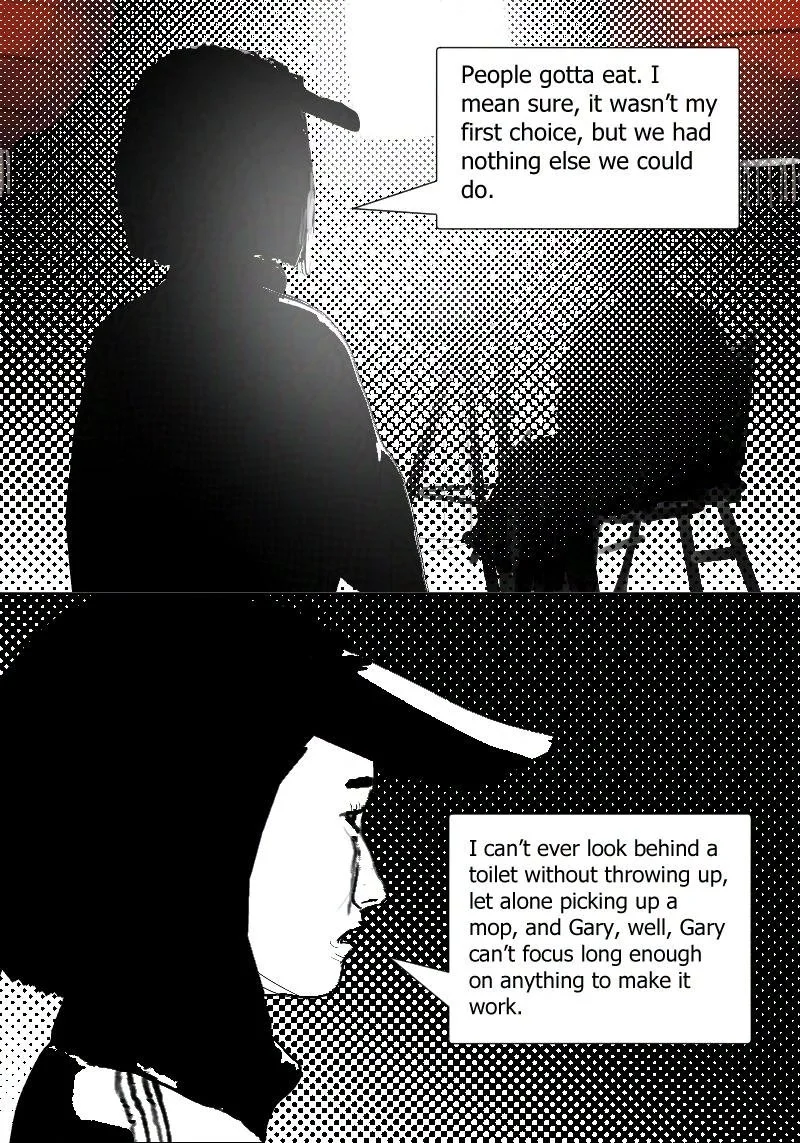 Two women talking, with speech bubbles. The first woman talks about how people have to eat and their limited options. The second woman comments about her fear of looking behind toilets and issues with focusing on cleaning.