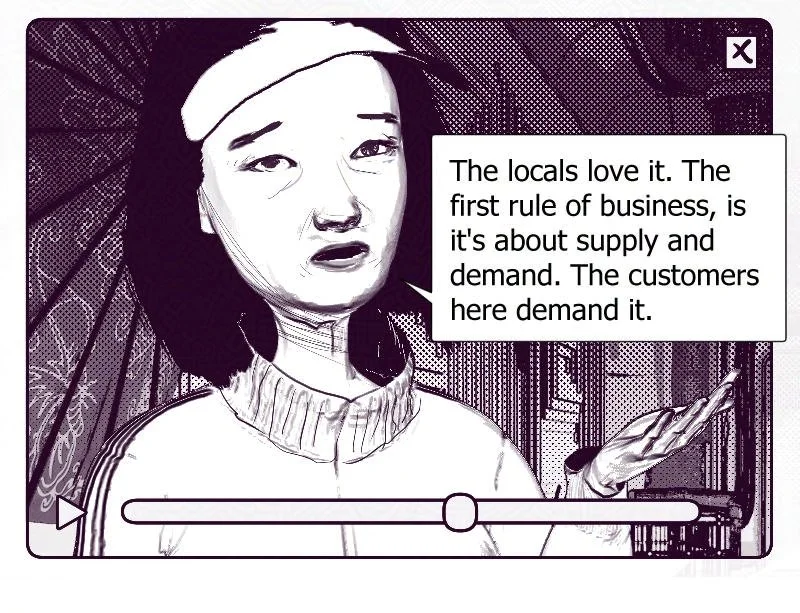 Drawing of a woman holding a cellphone and speaking, with a background of an umbrella and a speech bubble saying, 'The locals love it. The first rule of business, is it's about supply and demand. The customers here demand it.'