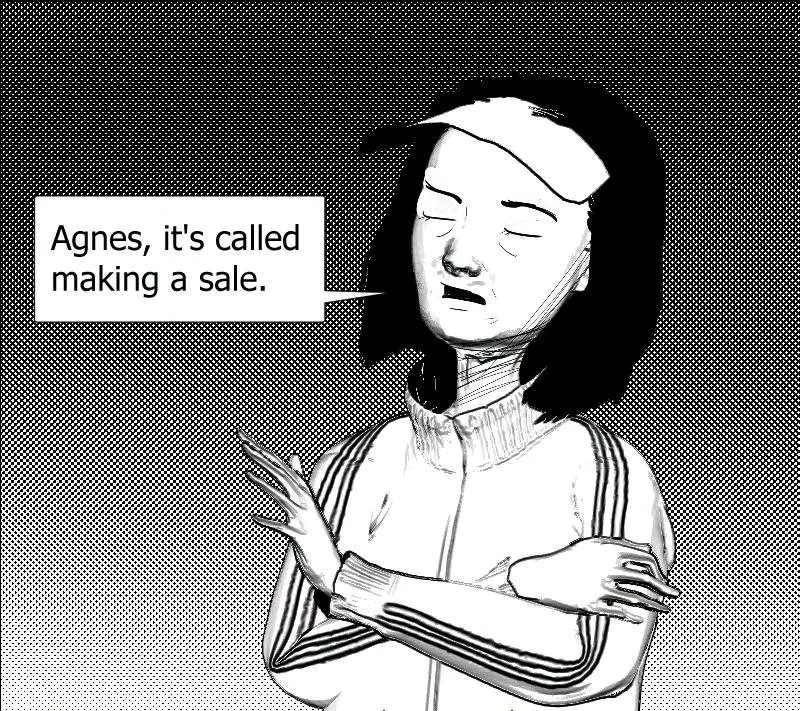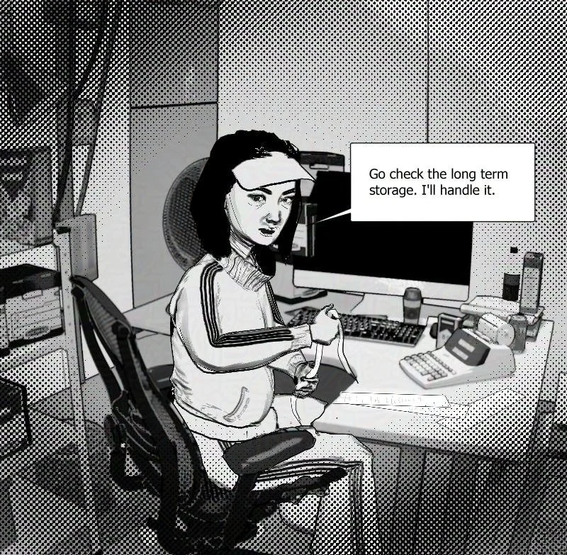 A woman sitting at a cluttered office desk with computer, phone, and papers, wearing a baseball cap and Tracksuit, with a speech bubble saying, 'Go check the long term storage. I'll handle it.'