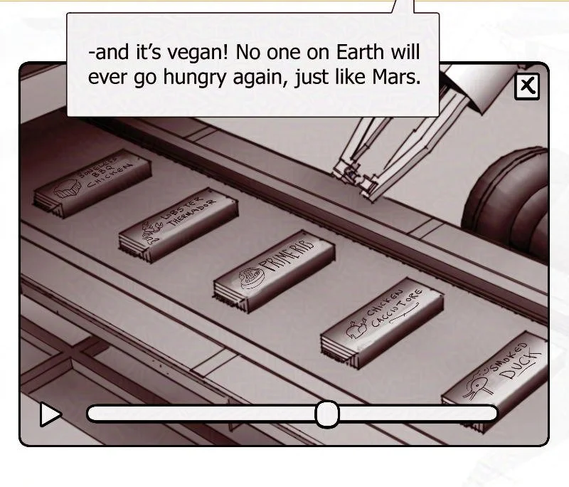 A vending machine with vegan snack bars labeled 'Chocolate Crunch,' 'Tofu & Tempeh,' 'Pineapple,' and 'Shocked Duck.' A speech bubble states, 'and it's vegan! No one on Earth will ever go hungry again, just like Mars.'