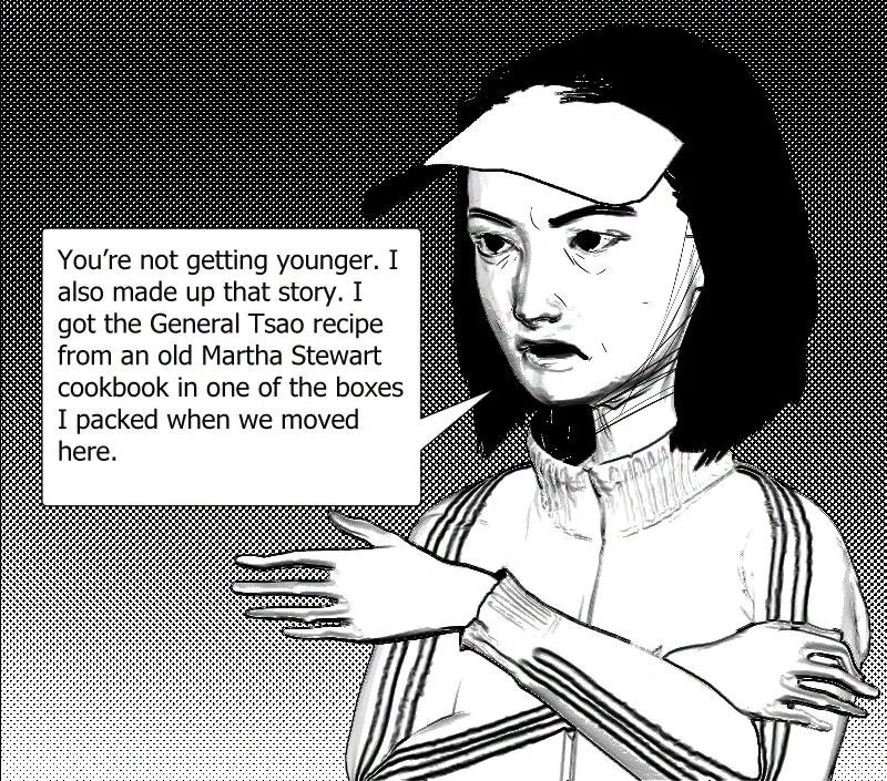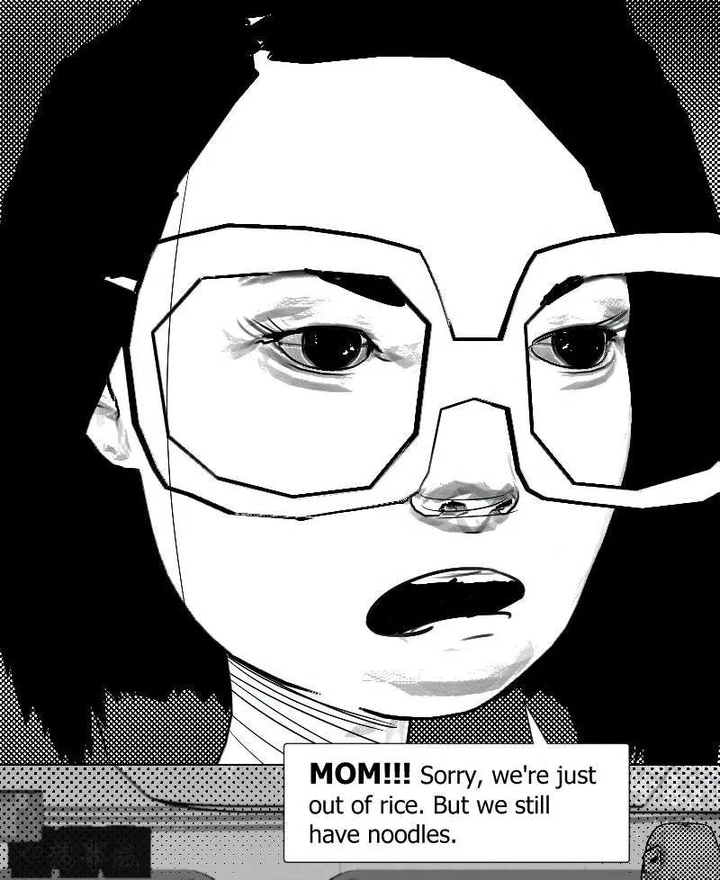 Comic-style illustration of a woman with large glasses and a surprised expression, with a speech bubble saying 'MOM!!! Sorry, we're just out of rice. But we still have noodles.'
