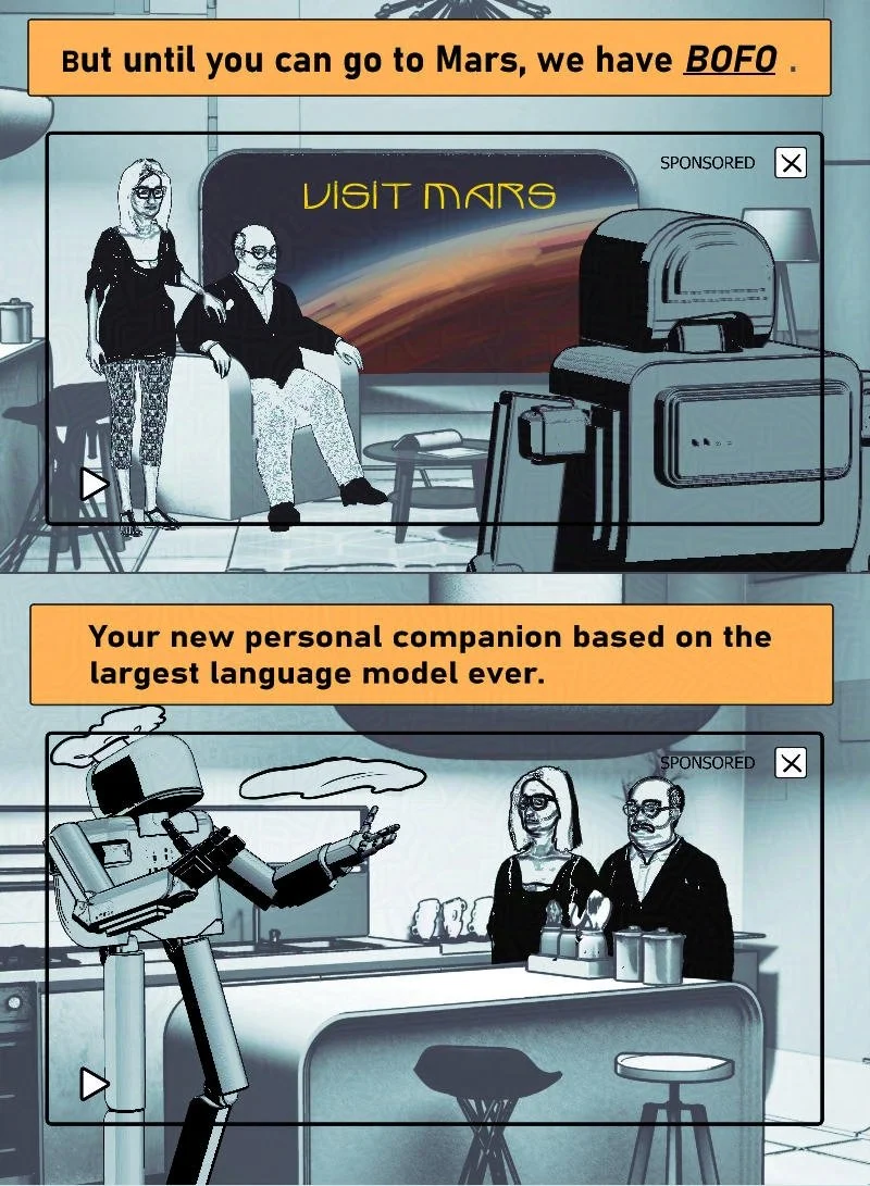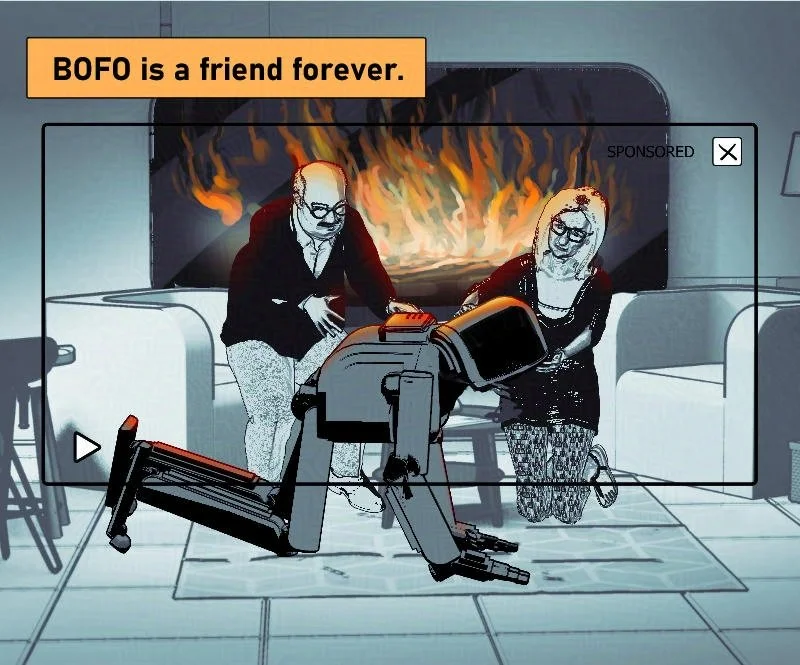 Illustration of two women with glasses, kneeling on the floor in front of a fireplace, in front of a security camera lens with a fire burning, with a caption that reads 'BOFO is a friend forever.'