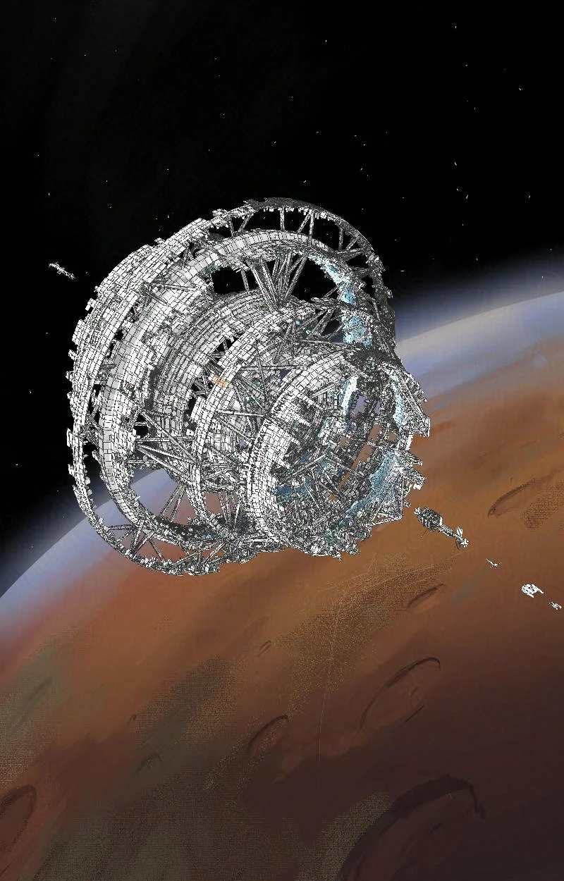A large, complex space station orbiting above a planet with a reddish atmosphere, set against the blackness of space with visible stars.