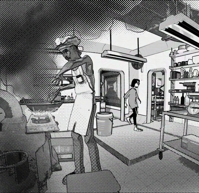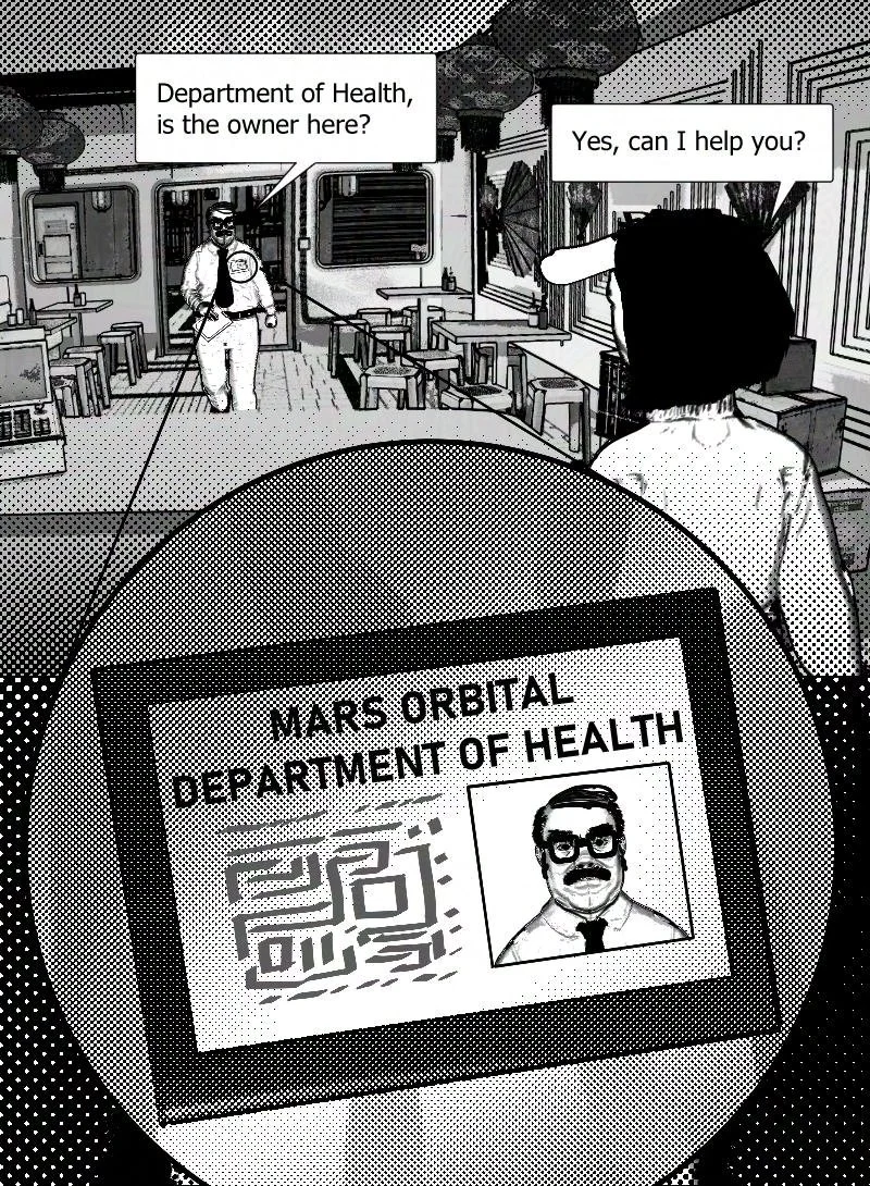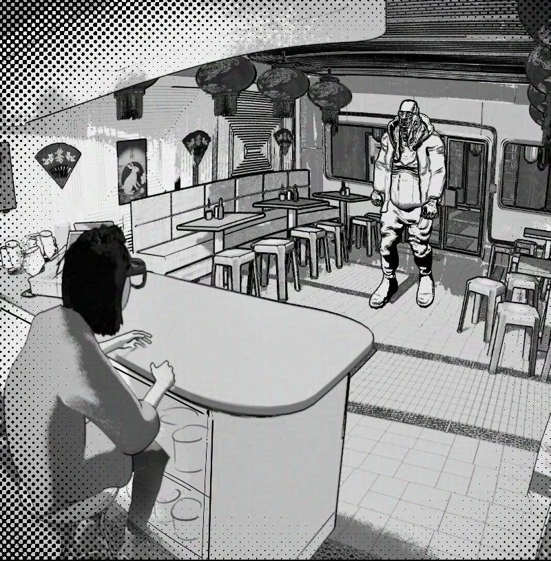 A cartoon-style drawing of a restaurant with a woman sitting at the bar, and a person in a hazmat suit standing in the dining area.
