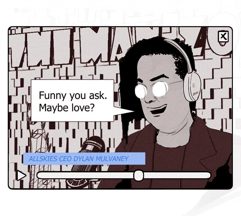 Cartoon illustration of a man with headphones, speaking into a microphone, with text saying "Funny you ask. Maybe love?" and a caption indicating he is Dylan Mulvaney, CEO of Allskies, in a recording studio setting.