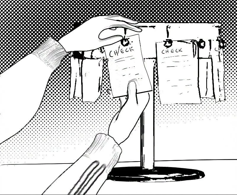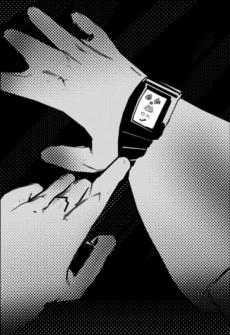 A black-and-white, stylized illustration of a person's hand wearing a smartwatch or fitness tracker, with another hand pointing to the device on their wrist.