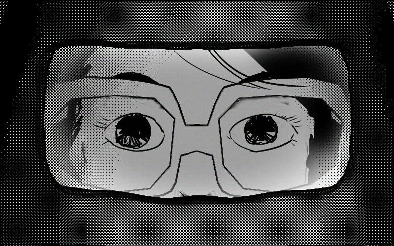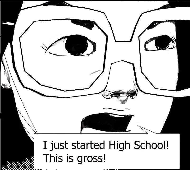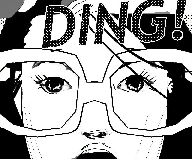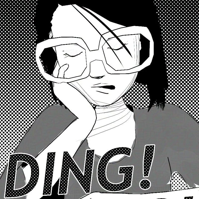 A black and white comic-style illustration of a girl wearing glasses with the word 'DING!' above her head in bold, dotted letters.