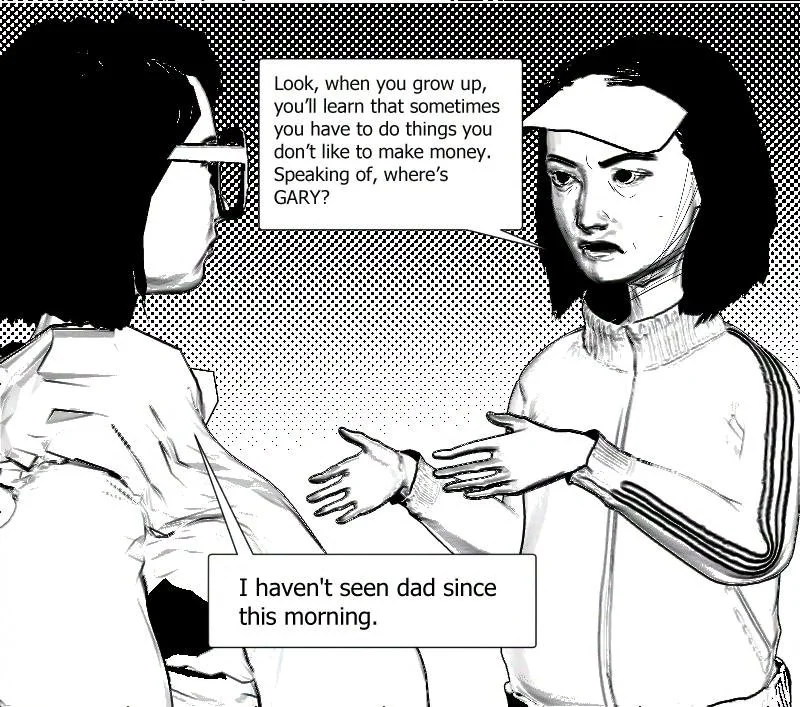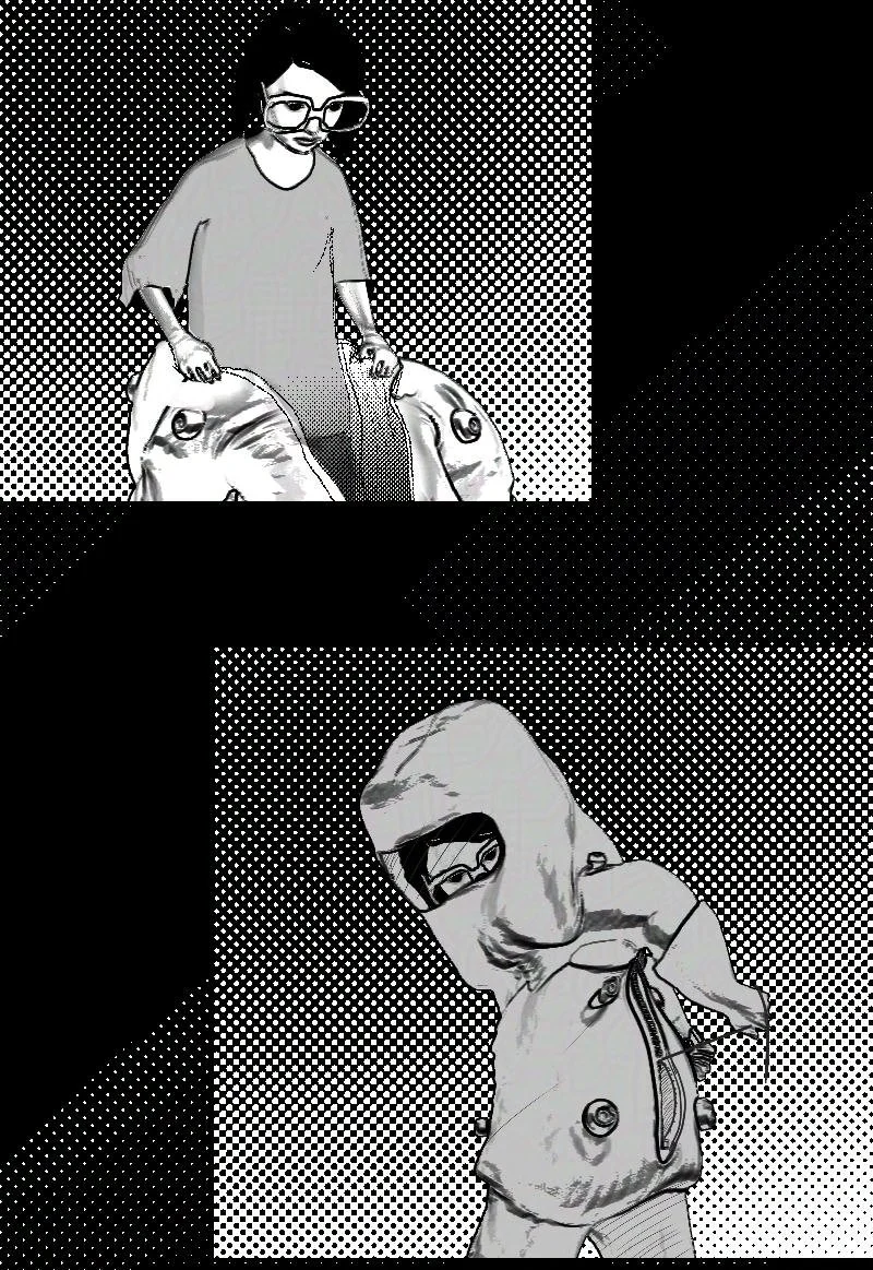 Black and white artwork of two children, one in a hoodie with a mask and the other with glasses and a large oversized coat, both with exaggerated facial features, against a dotted background