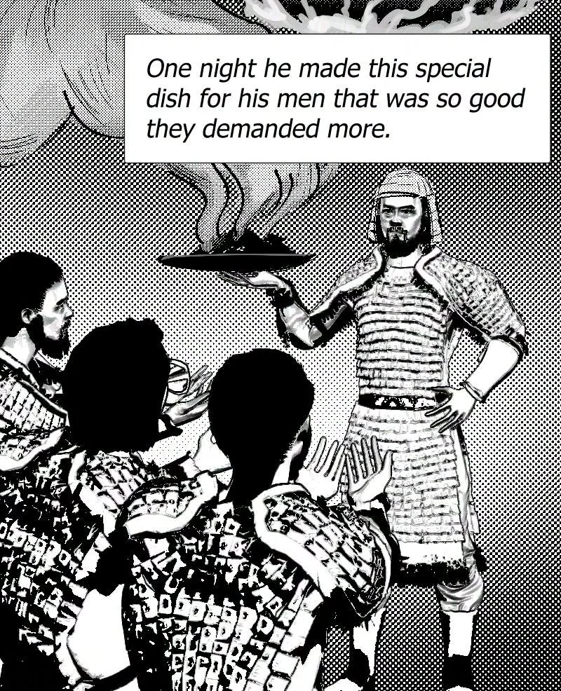 Black and white cartoon image of a man dressed as a knight, holding a steaming dish of food, with a speech bubble that says, "One night he made this special dish for his men that was so good they demanded more." Four soldiers are looking at him in aw