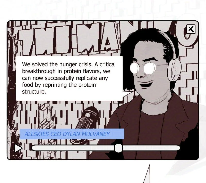 Illustration of a man with dark hair, wearing headphones and a jacket, speaking into a microphone during a radio or podcast interview. A speech bubble next to him says, 'We solved the hunger crisis. A critical breakthrough in protein flavors, we can