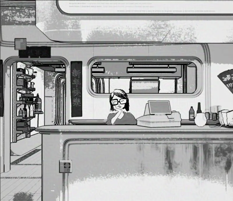 A black and white illustration of a woman with glasses and short hair sitting at a counter inside a restaurant or cafe, with shelves of bottles on the left and a window behind her showing the outside.