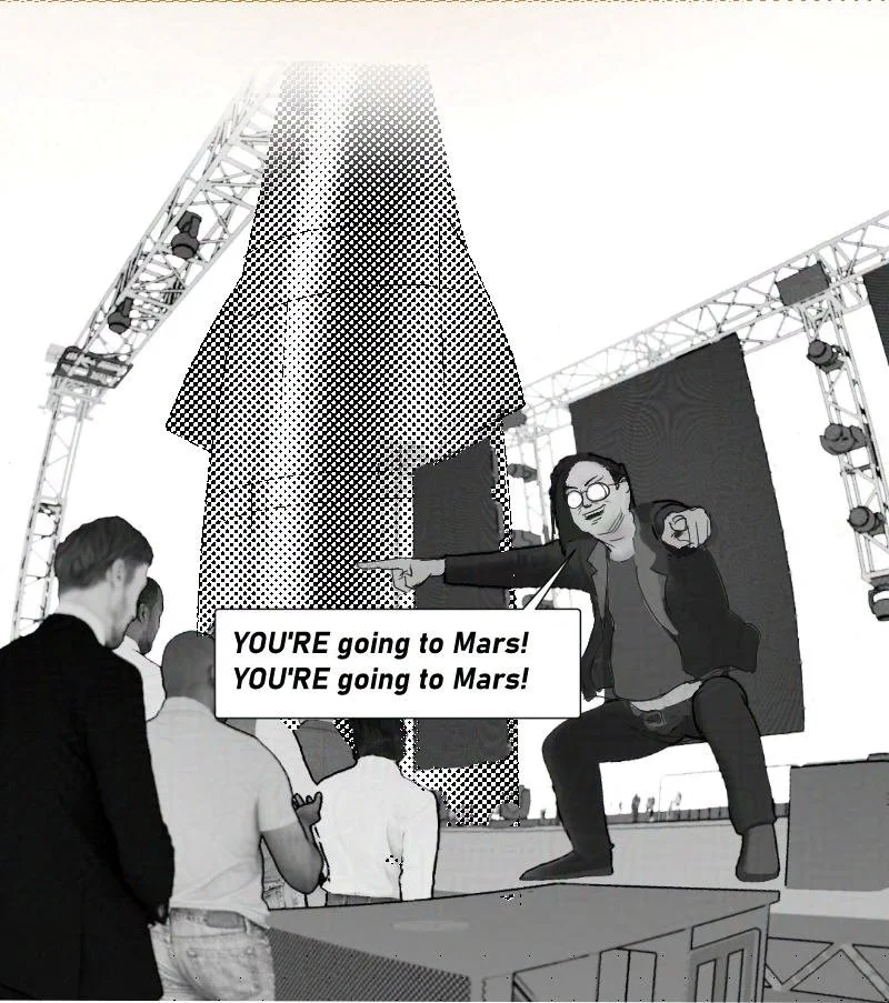 A cartoon person with glasses and long hair, pointing and cheering on stage at a festival, shouting "YOU'RE going to Mars!" to an audience.