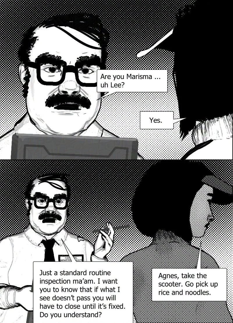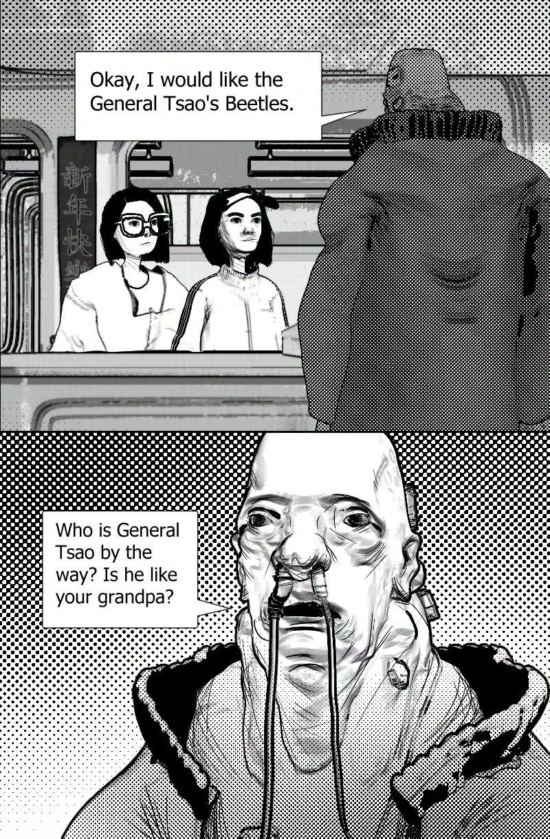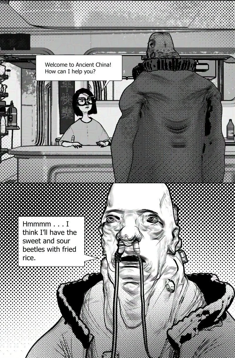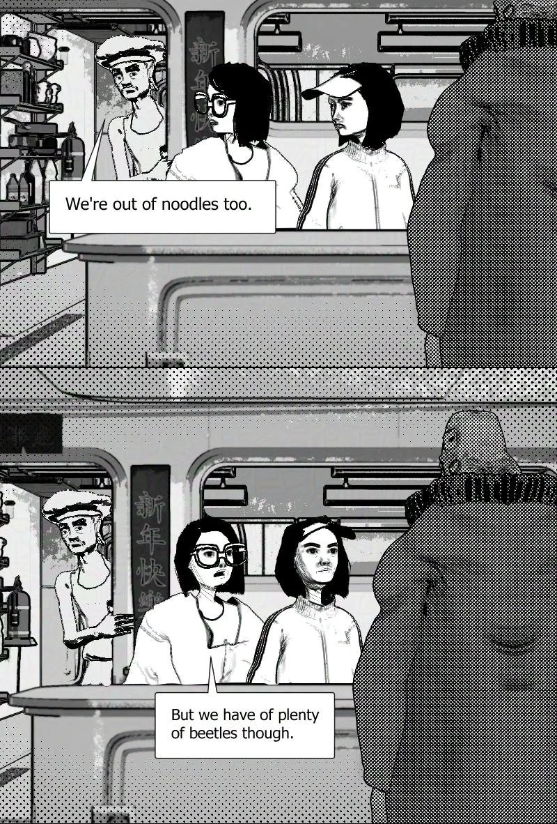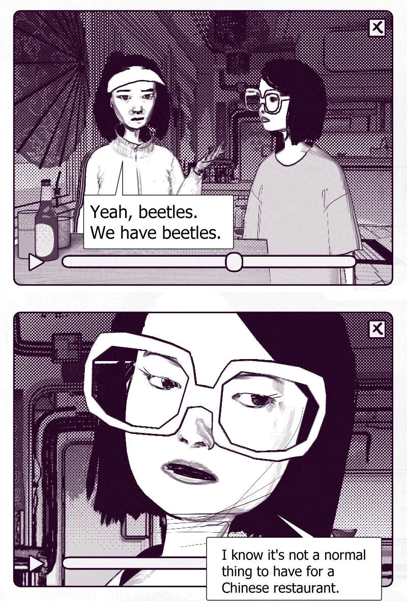 A comic strip featuring two women at a restaurant talking about having beetles for a dish. One woman says, "Yeah, beetles. We have beetles," and the other woman responds, "I know it's not a normal thing to have for a Chinese restaurant." The scene is