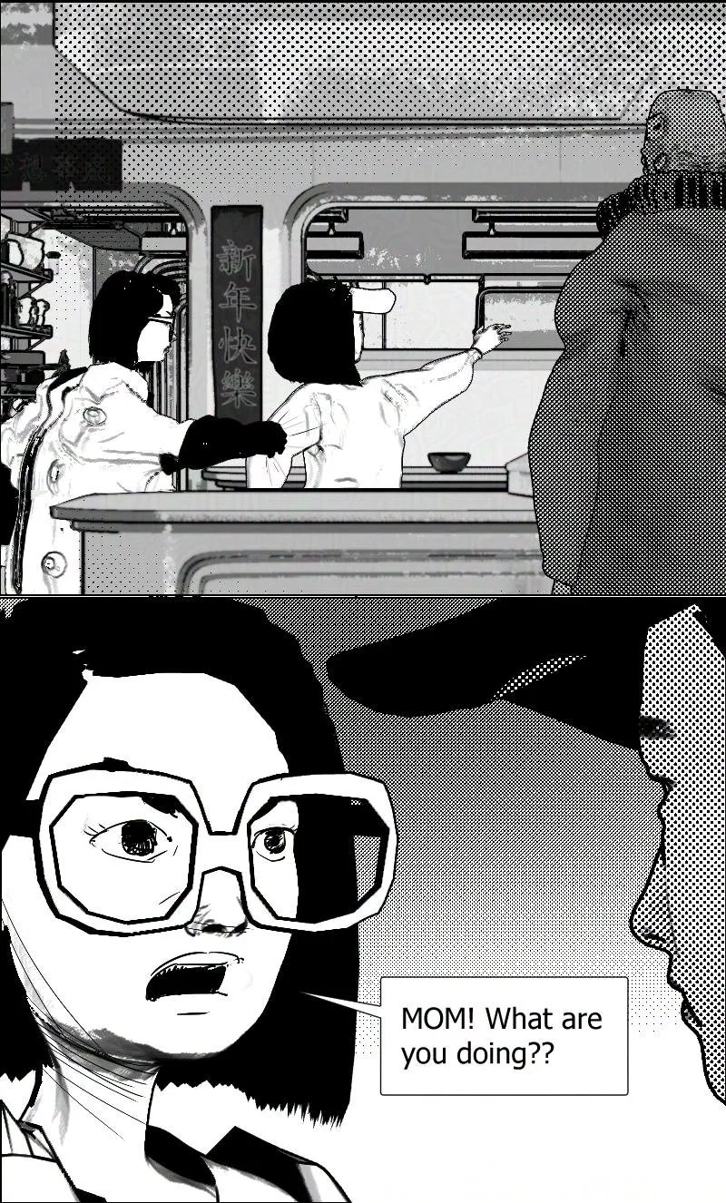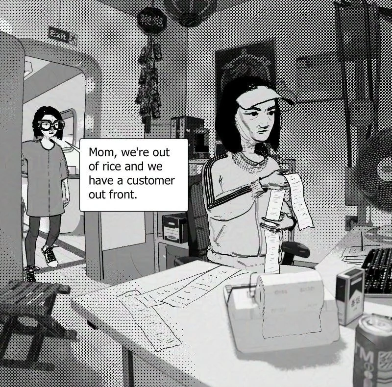 Two children stand at a restaurant counter, talking to a Chinese restaurant worker behind the counter. One child comments about being out of rice, and the worker responds humorously about her daughter being single.