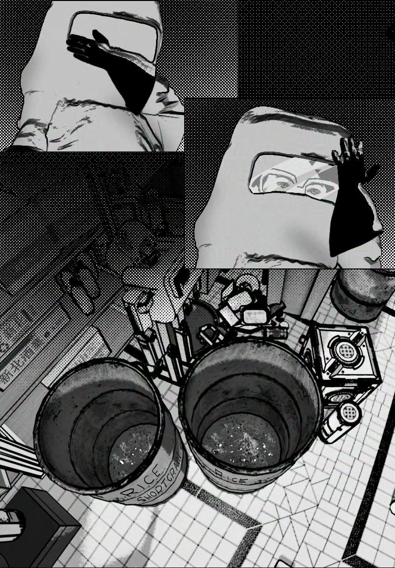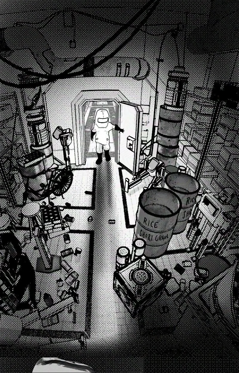 Black and white illustration of a laboratory or storage room with shelves, containers labeled rice and short grain rice, equipment, and a person in a hazmat suit entering through a door.