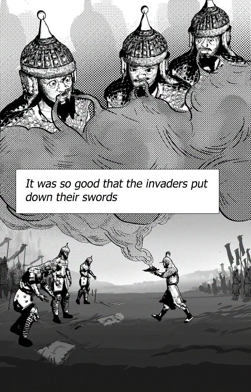 Black and white comic-style illustration of three warriors wearing helmets, with a speech bubble saying, 'It was so good that the invaders put down their swords.' Below, warriors are depicted standing in a line on a battlefield, with one person walki