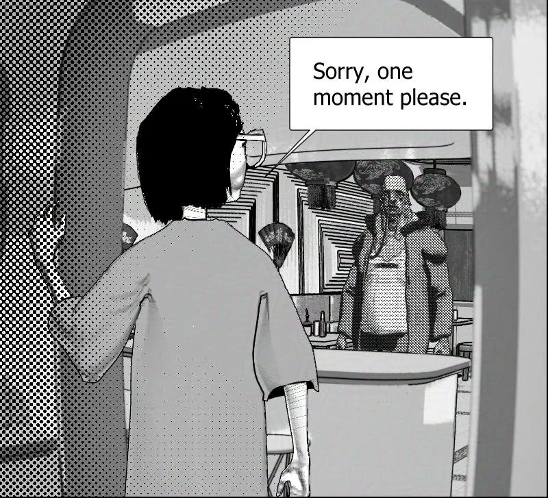 A woman in a restaurant speaks to another woman behind the counter, saying "Sorry, one moment please." The scene appears to be in a comic or stylized illustration with halftone shading.