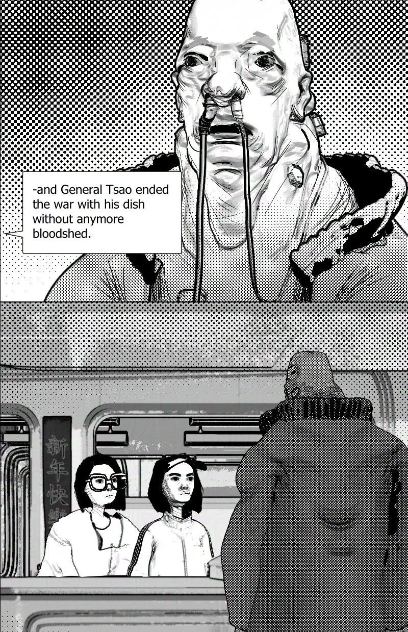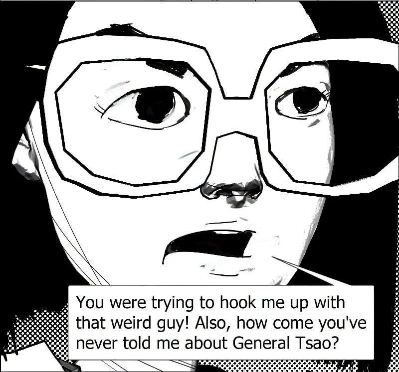 A comic-style black and white illustration of two women on a bus, one speaking to a muscular man with a large nose and a hooded jacket. The speech bubbles read: "Okay, I would like the General Tsao's Beedles" and "Who is General Tsao by the way? Is h