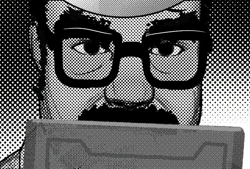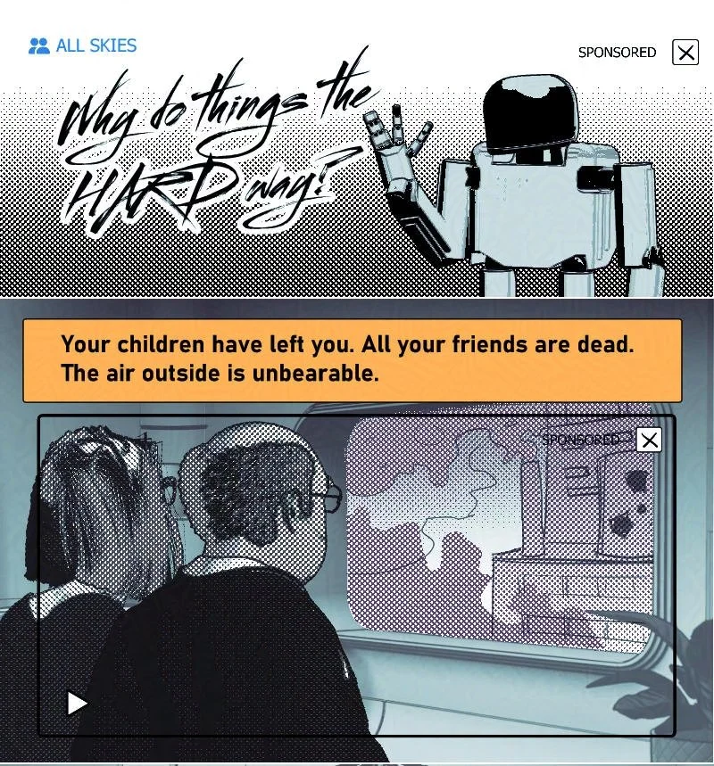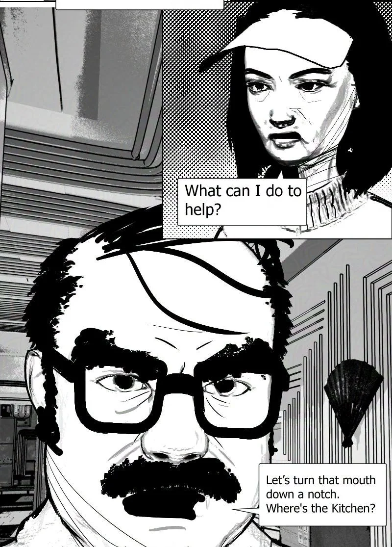 A black and white comic-style illustration of a person with a excited expression wearing a respirator mask with two hoses. Below, a man with long hair and a hoodie is talking to two young women working at a kiosk or counter, all in a subway or train
