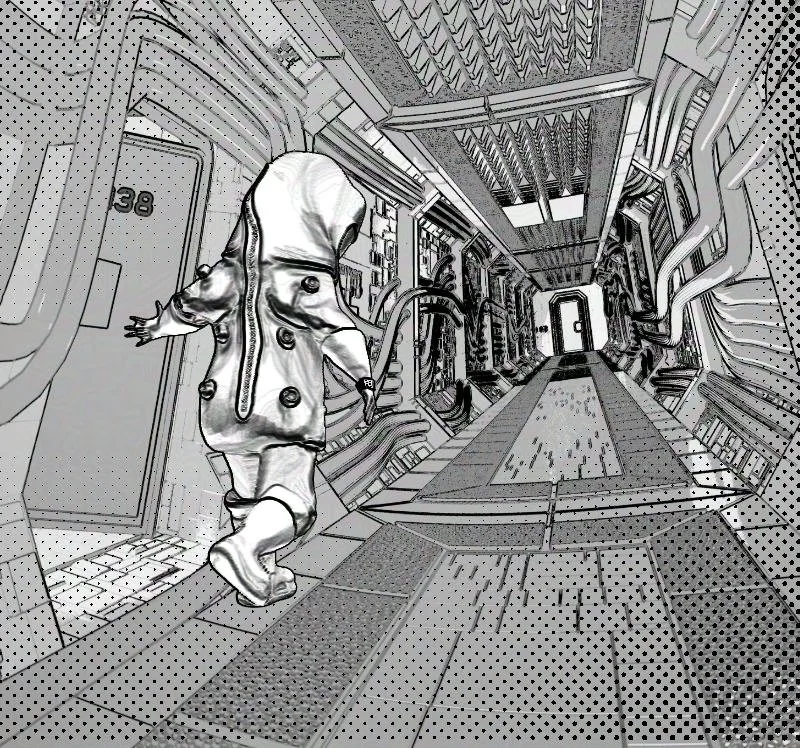 A person wearing an astronaut suit walking down a corridor inside a spaceship or space station.