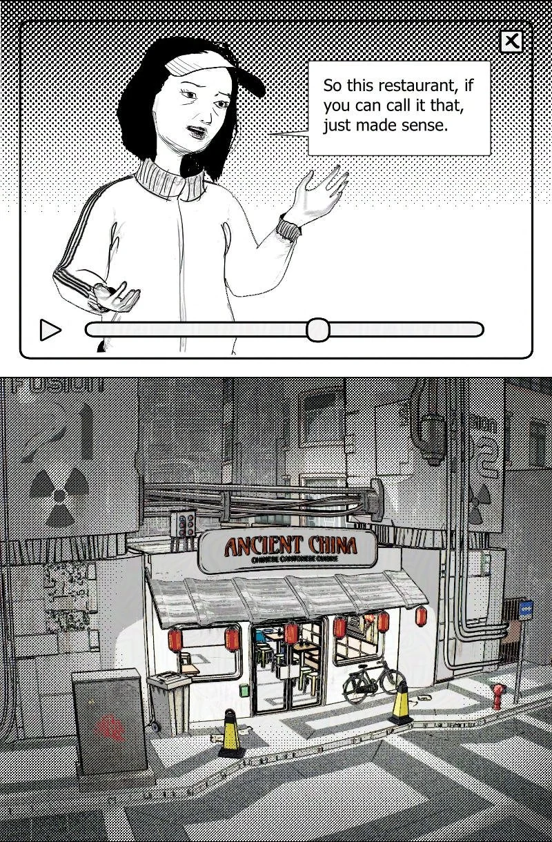 A cartoon woman speaking about a restaurant, with a real-life image of a Chinese restaurant called 'Ancient China' in the background, featuring construction cones and a bicycle outside.