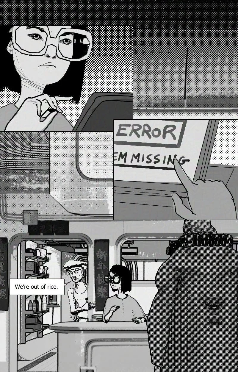 Comic-style illustration showing a woman with glasses working on a computer, an error message on a screen, and a store scene where a clerk tells a customer they are out of rice.