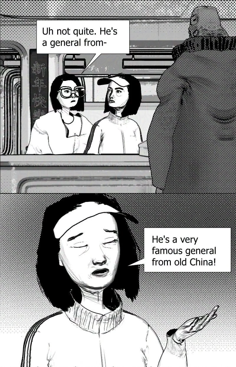 Comic strip with three characters, two women and a man dressed as Darth Vader. The women are talking, one says, "Uh not quite. He's a general from-" and the other responds, "He's a very famous general from old China!" The scene is in black and white