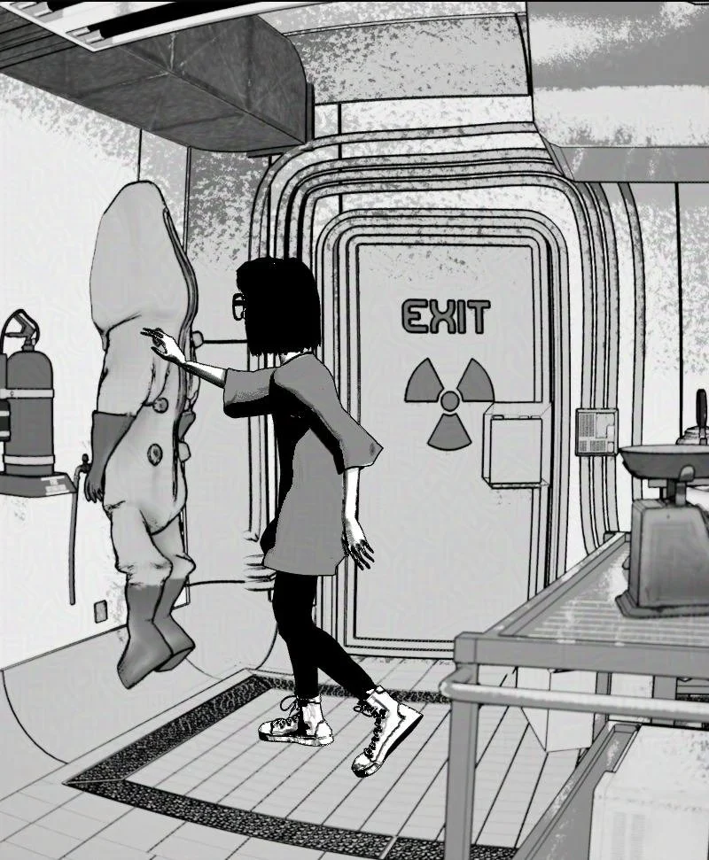 A woman in a protective suit is walking inside a facility with a radiation warning sign on a door marked 'EXIT', indicating a potentially hazardous area related to radiation or nuclear materials.
