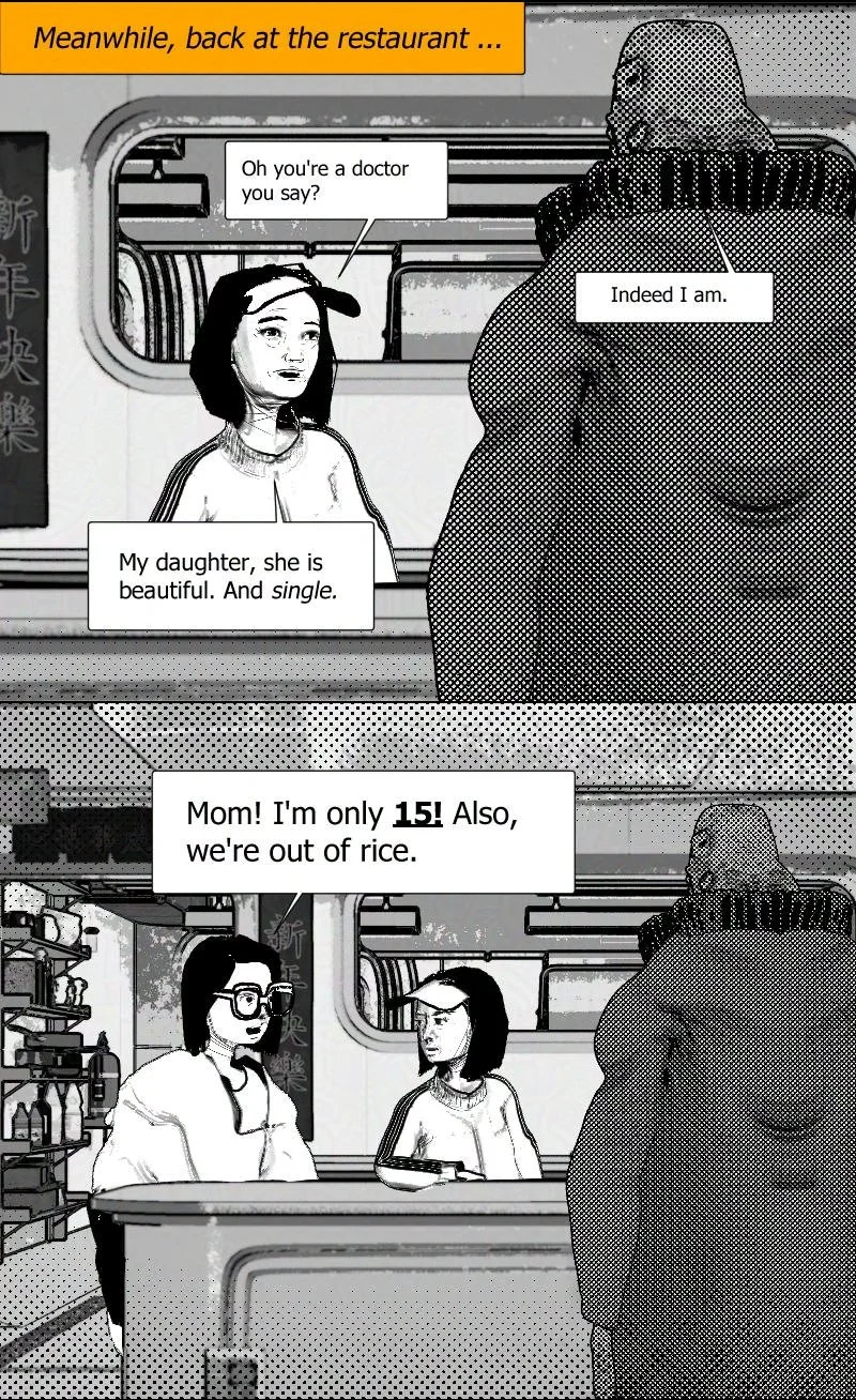 Comic strip showing a woman at a counter talking to a large, muscular man. The woman says, 'Oh you're a doctor you say?' and 'My daughter, she is beautiful. And single.' The woman behind the counter says, 'Mom! I'm only 15! Also, we're out of rice.'