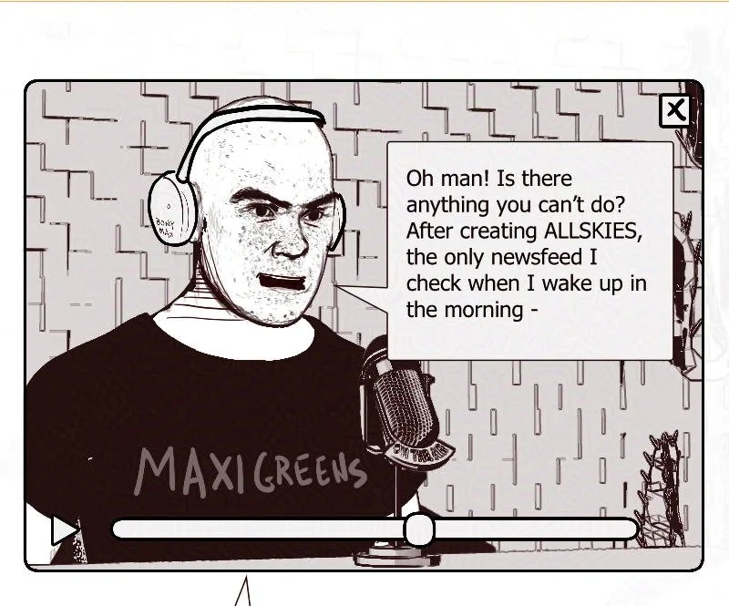Black and white digital drawing of a man with headphones in front of a microphone, speech bubble says, "Oh man! Is there anything you can't do? After creating ALLSKIES, the only newsfeed I check when I wake up in the morning -" behind is a textured w