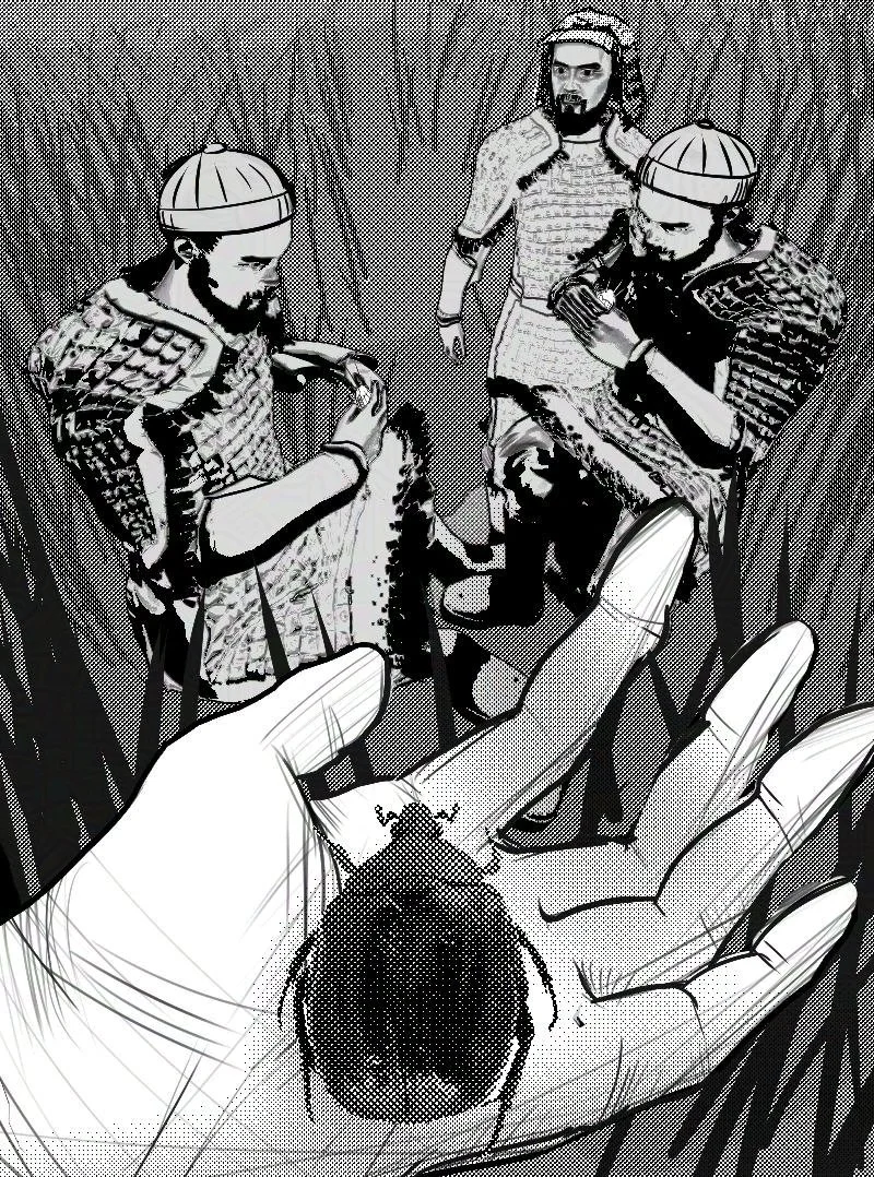 Black and white illustration of four Roman soldiers standing in a forest, with a hand holding a beetle in the foreground.